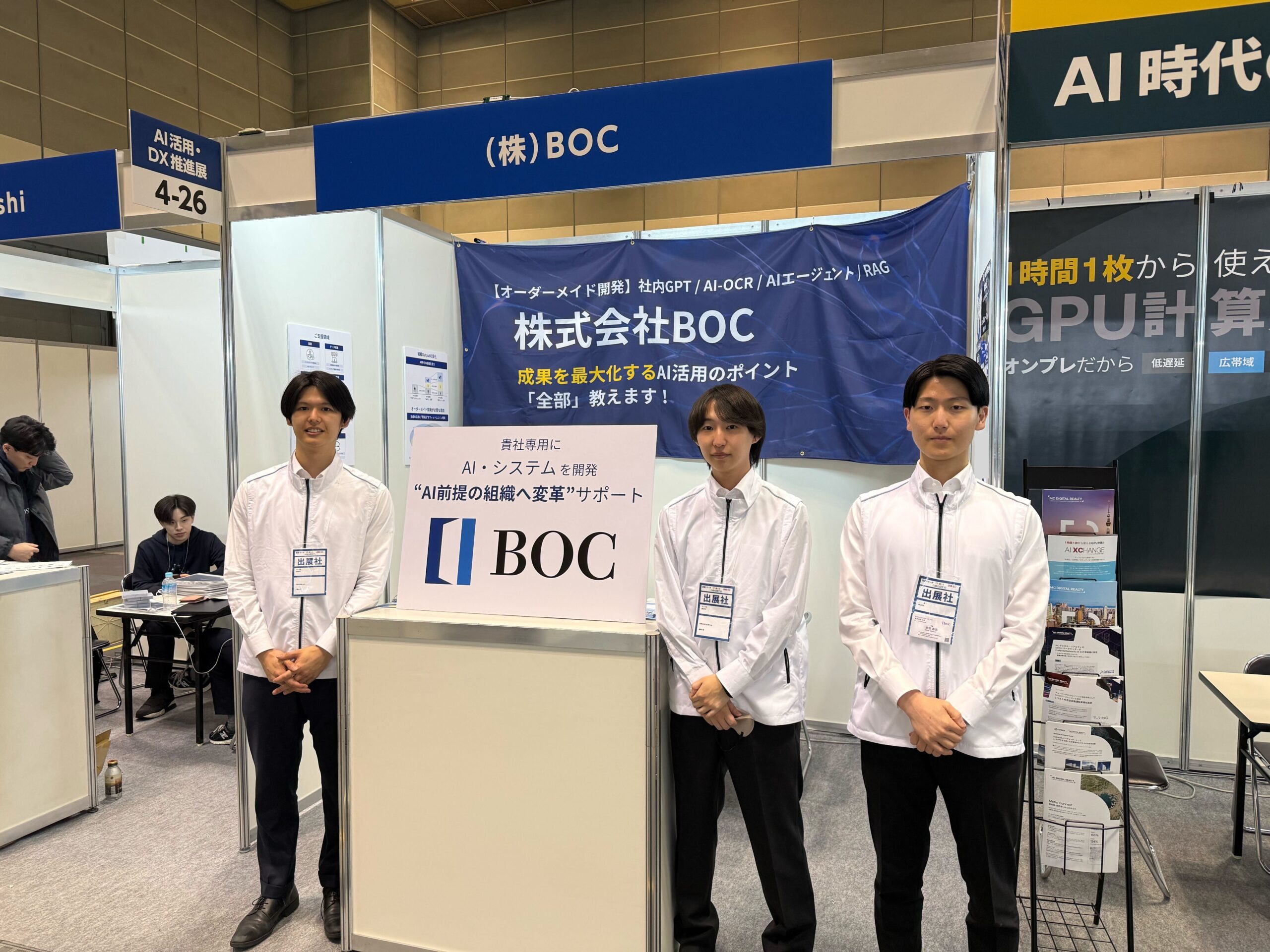 テクノロジーと未来を創る | Our Features 私たちの強み 01 提案力 お客様の真の課題を深く分析・特定 最適な提案と実行で成果創出をサポート 02 技術力 コンペティション受賞歴のあるメンバーが在籍 お客様の課題に最適なAIソリューションを提供 03 スピード 他社より3~6ヶ月早いスピード開発が可能 ビジネスへのAI導入をいち早く実現 会社概要 > | Services 開発&コンサルティング AI導入コンサルティング ビジネス課題の整理からAIの選定・導入まで、経験豊富な専門家が伴走します View More オーダーメイドAI開発 生成AI活用の設計から実装・運用まで一貫対応し、業界課題を解決する革新的なAIシステムを提供します View More AI顧問サービス 導入設計からオーダーメイド開発まで、AI導入のすべてを「全部おまかせ」ください View More AI DX研修サービス 業務効率化や内製化のための研修を行い、貴社の課題に合わせてハンズオンで徹底支援します View More | Cases 実績紹介 コンプライアンスチェック 営業トークスクリプト 連絡先リスト ECサイト商品説明 その他の事例 | Our Message メッセージ 私たちはAIを単なる技術ではなく、お客様の課題解決と未来の変革を共に実現する”パートナー”と考えています。実践と伴走で、お客様のビジネスに新たな価値を創出します。 | News お知らせ 2026年3月3日 【出展報告】株式会社BOC、「第2回 IT・情シスDXPO 大阪’26」に出展いたしました 2025年10月8日 株式会社BOC 第6回 AI・人工知能EXPO【秋】に出展 2025年6月10日 日本設備管理学会 × 株式会社BOC 共同研究をスタート 2025年6月10日 代表三橋が日本設備管理学会のセミナーで登壇しました 2025年3月28日 株式会社BOC 第9回 AI・人工知能EXPO【春】に出展 一覧を見る > BOCはAI技術で貴社の課題を解決します。 お見積もりご相談は無料で承っております。業務内容や課題をヒアリングのうえ、最適なご提案をさせていただきます。 お問い合わせ >