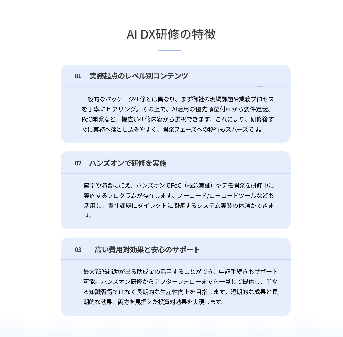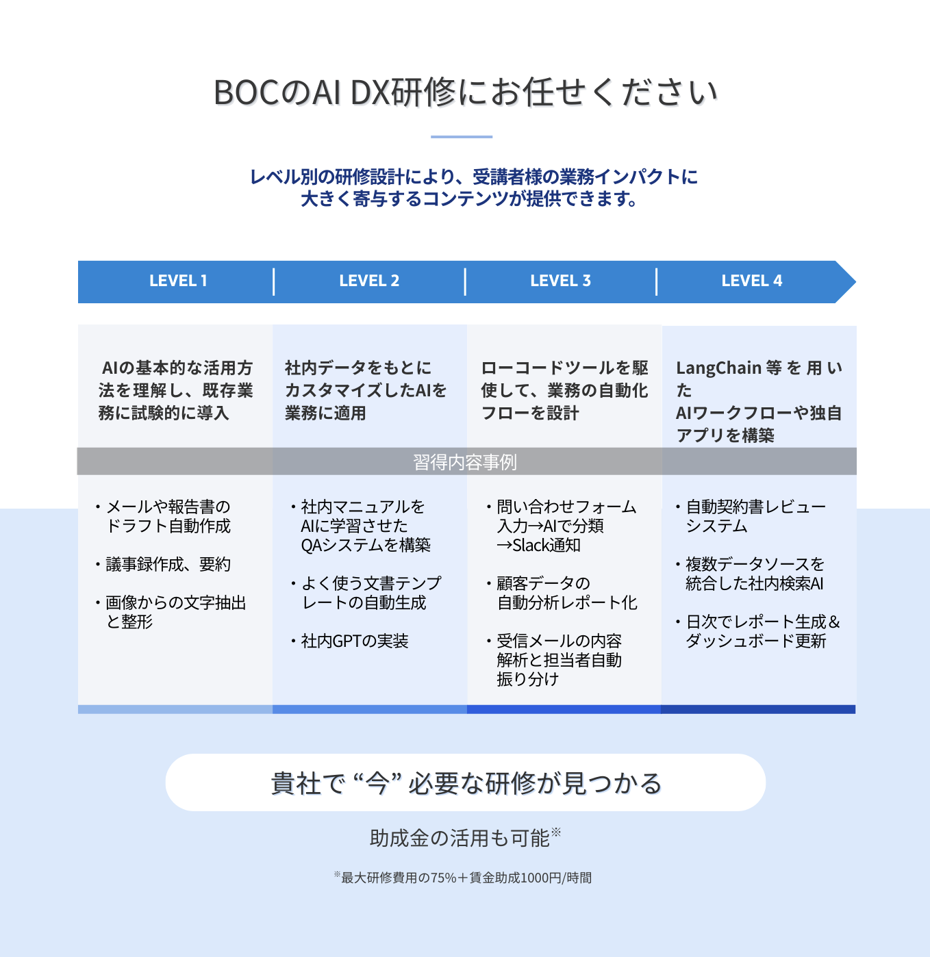 Services|開発&コンサルティング BOC AI DX研修サービス どんな研修なのか?どれくらいの費用感でできるのか?もっと詳細を知りたい方はお問い合わせください。5~10分の簡単顎相談でも大歓迎 30秒で無料申し込み よくあるご質問 研修のレベル感について、初心者でも受講可能? もちろん受講可能です。受講者様のリテラシーレベルに合わせ、研修内容を選択することができますので、初めてAIに触れる方でも安心してご参加いただけます。 助成金の受給確率は? 採択率の低い補助金とは異なり、助成金は要件を満たせば基本的に受給が可能です。申請にあたっては、弊社または提携する社労士法人によるサポートもご利用いただけます。 所要時間と開催方式は? 計10時間、1回あたり60〜120分の動画研修またはハンズオン研修をご用意しています。ハンズオンは対面を基本としますが、オンライン併用や完全オンラインなど、貴社の状況に合わせて柔軟に対応可能です。 お問い合わせはこちら